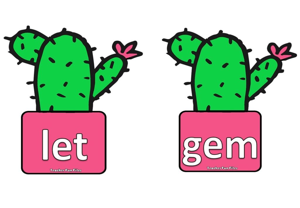 Words with short /e/ vowel sounds are bed, fed, red, wed, leg and beg. Here are some flashcards with words having short /e/ vowel sounds in cactus theme.
