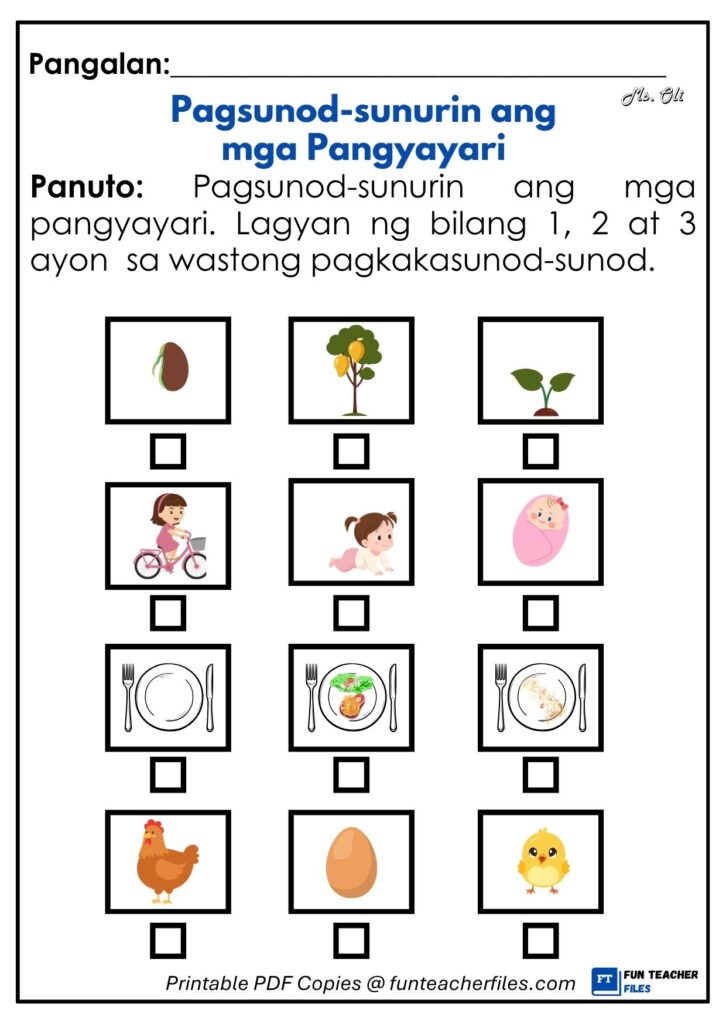 Tuklasin ang tamang ayos ng mga pangyayari sa Wastong Pagkakasunod-sunod ng mga Pangyayari Worksheet. Sa gawaing ito, aayusin ng mga bata ang mga larawan ayon sa tamang pagkakasunod. Lagyan ng bilang 1, 2 at 3.