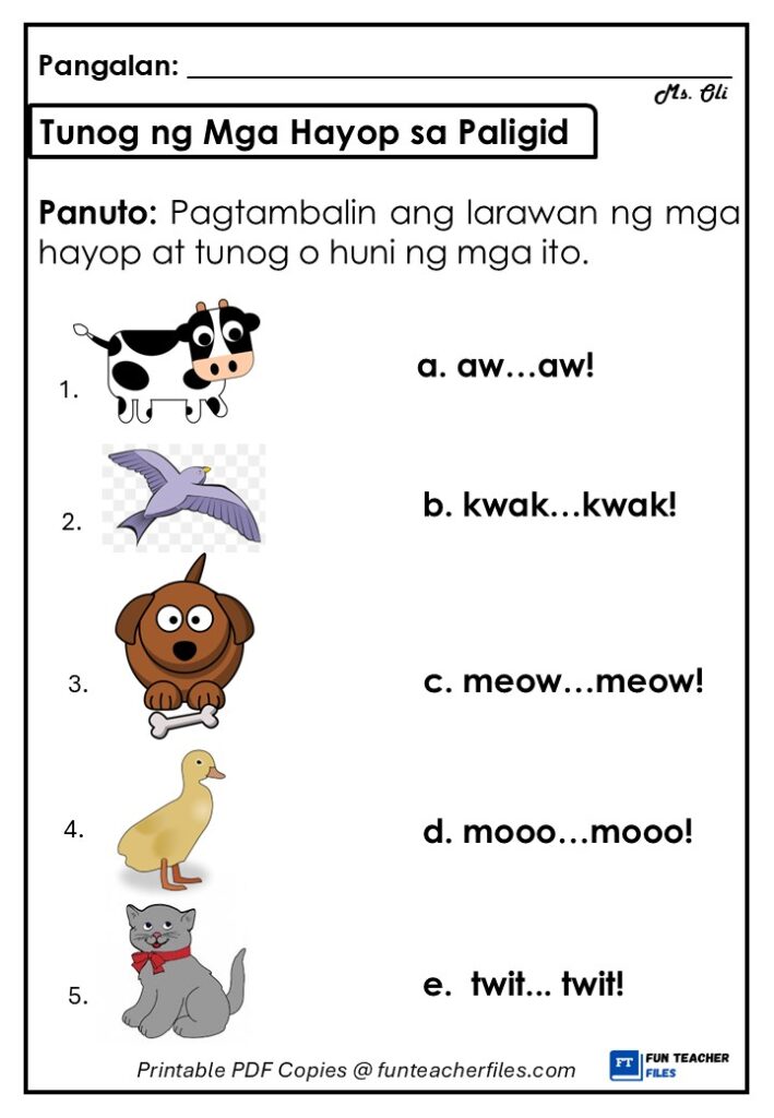 Kilalanin natin ang iba’t ibang hayop at ang mga tunog na kanilang nililikha. Panuto: Pagtambalin ang larawan ng mga hayop at tunog o huni ng mga ito.