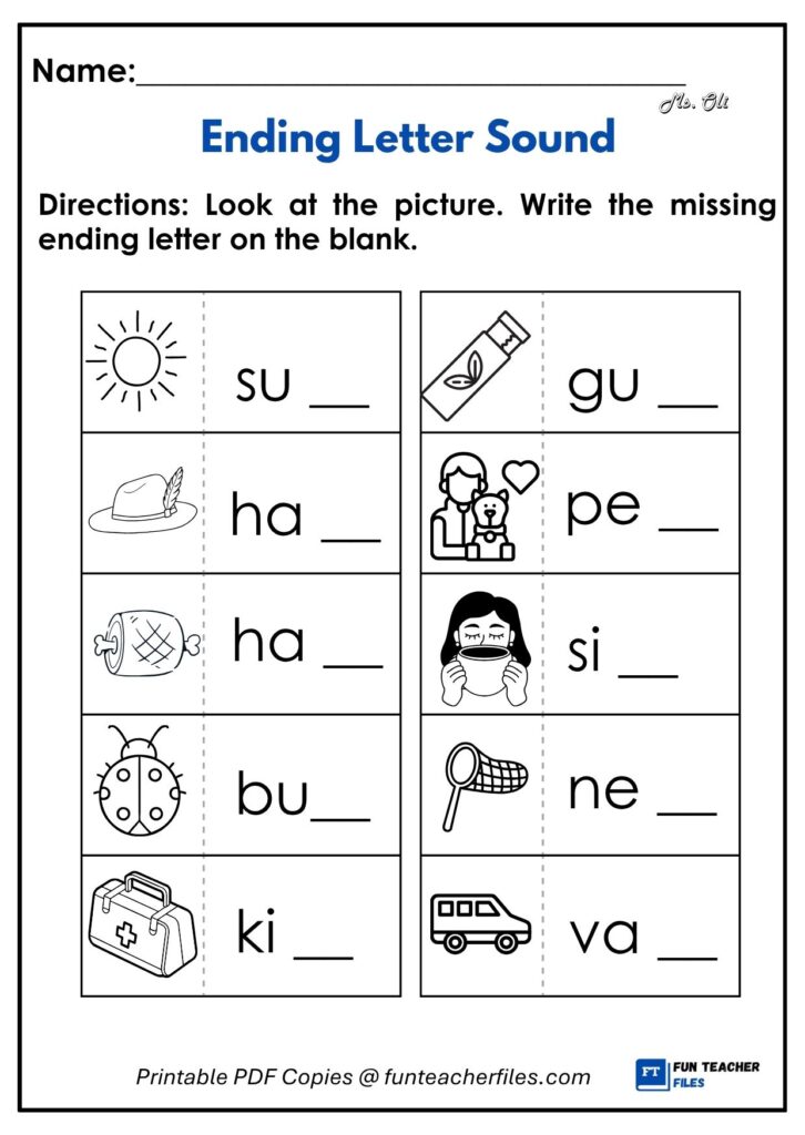 The ending letter sound is the last sound you hear in a word. It helps us know how a word ends and how to spell it correctly. In this worksheet, look at each picture, say the word, and write the missing ending letter.