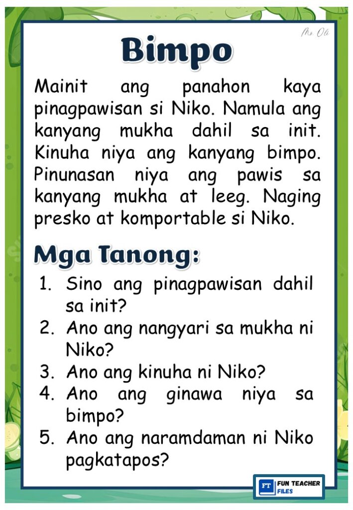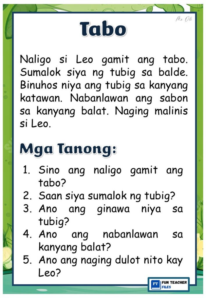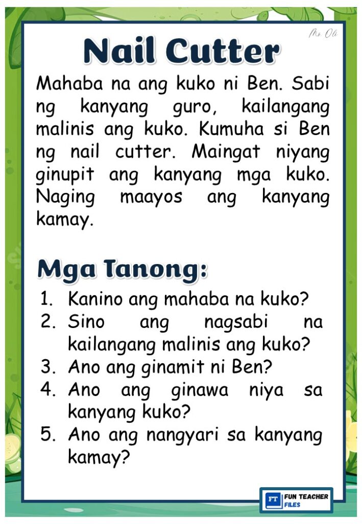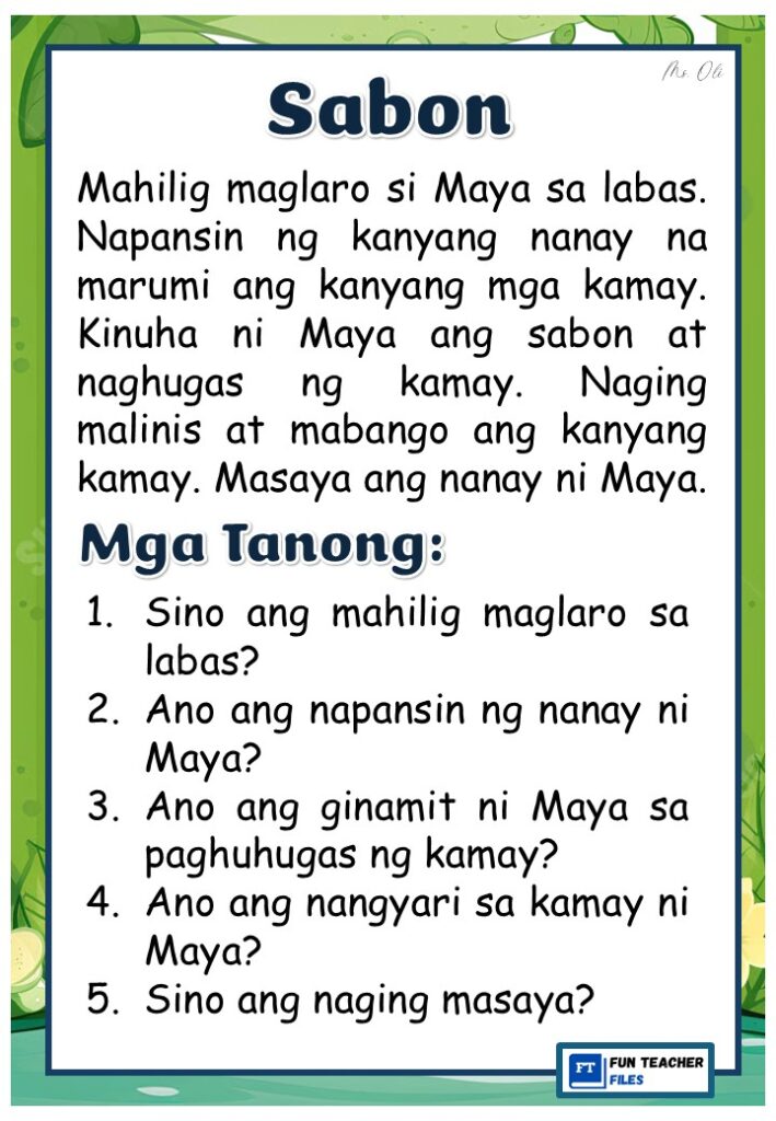 Practice reading with these Filipino Reading Materials with Comprehension Questions. These can be useful for remedial instruction or reading enhancement activity. Passages include: Sabon, Sepilyo, Nail Cutter, Suklay, Tabo, at Bimpo.