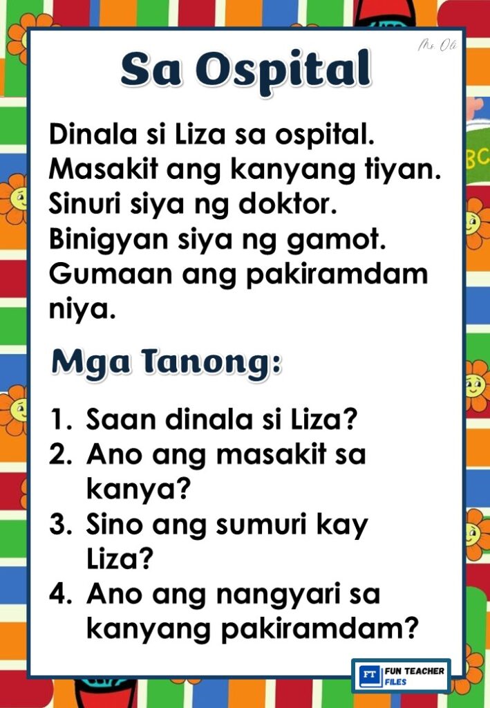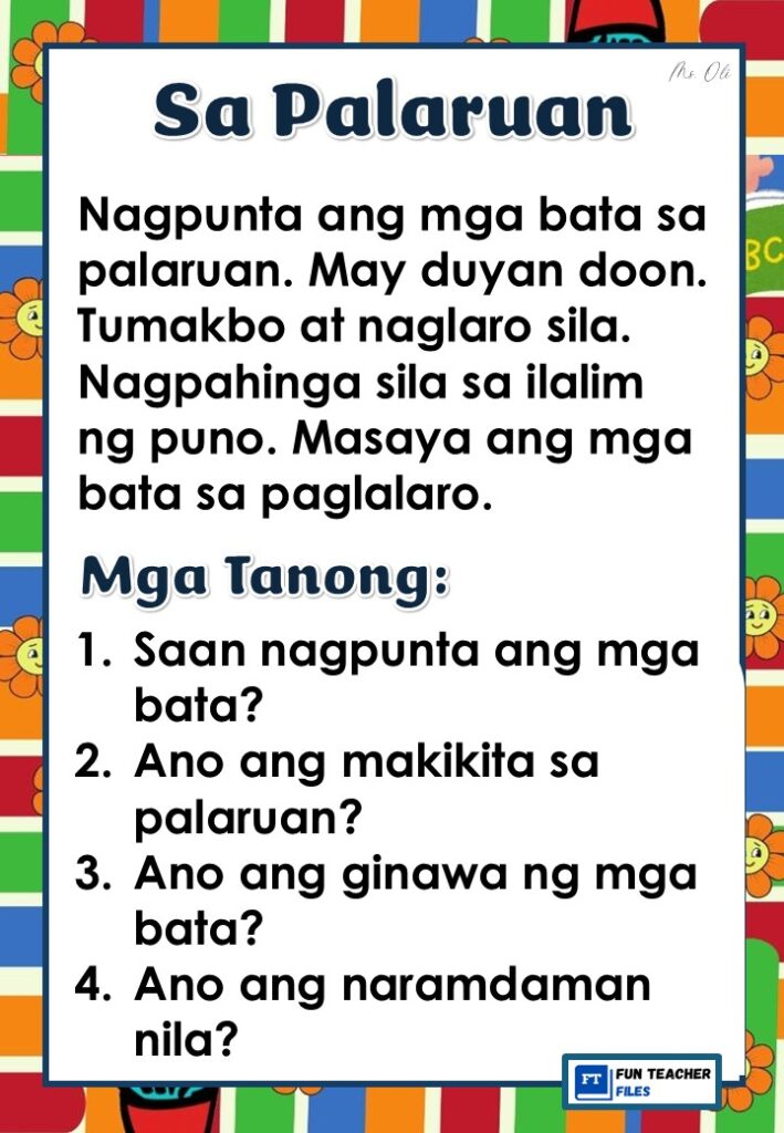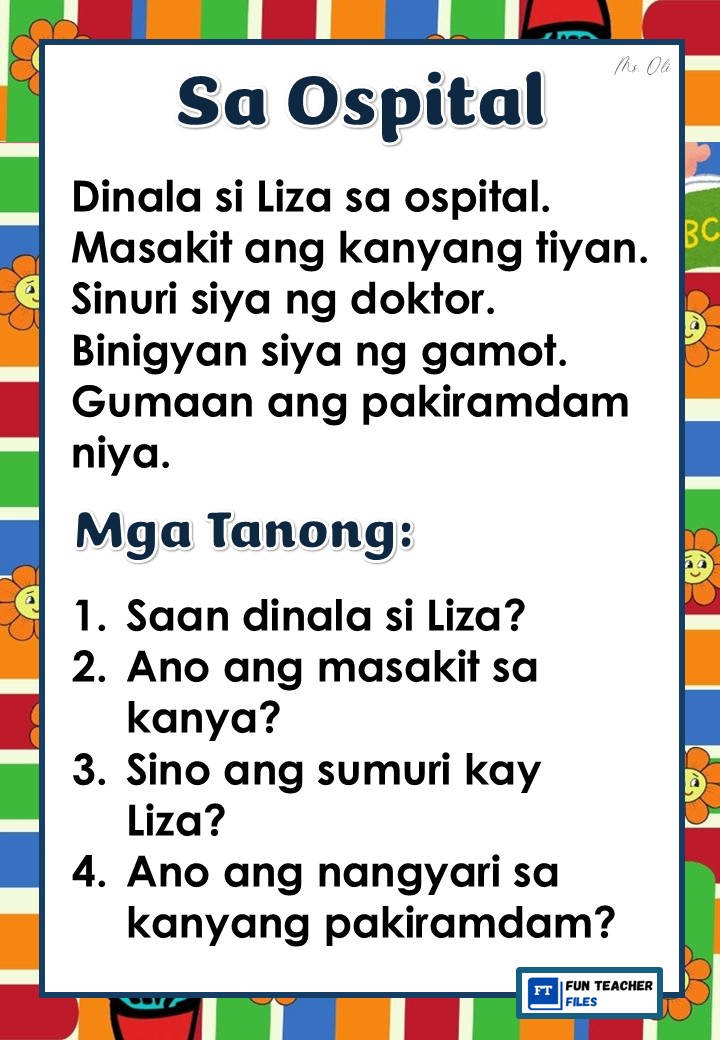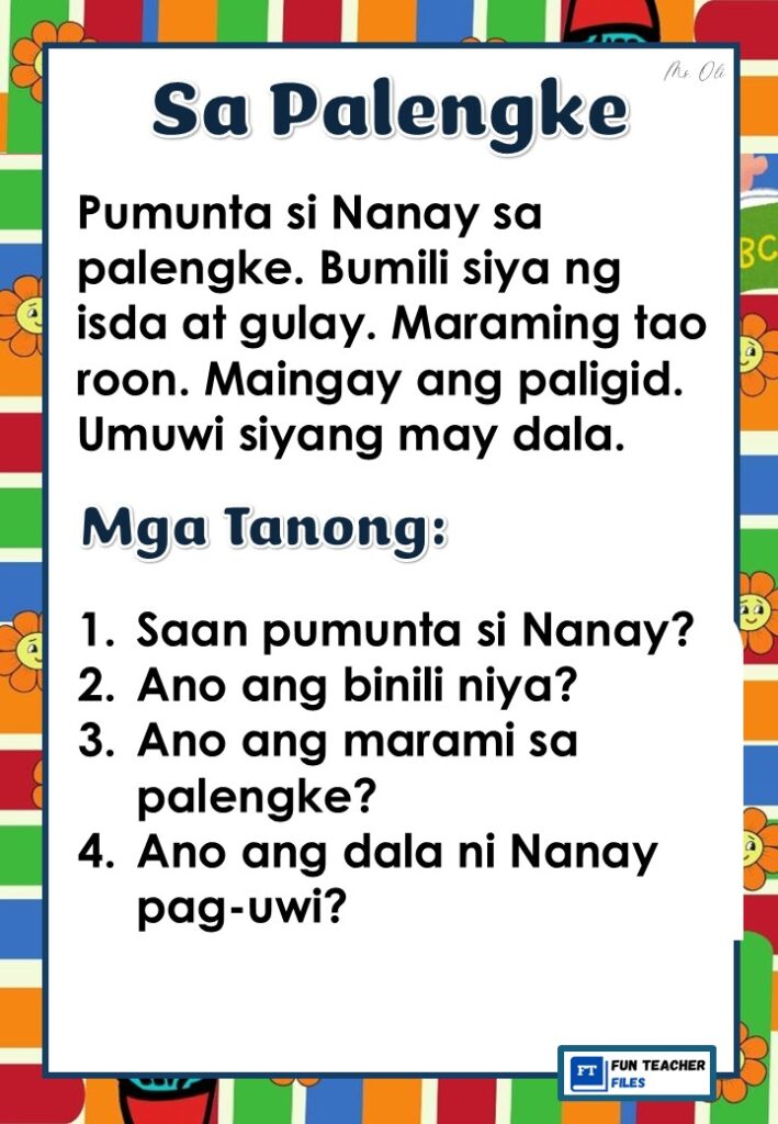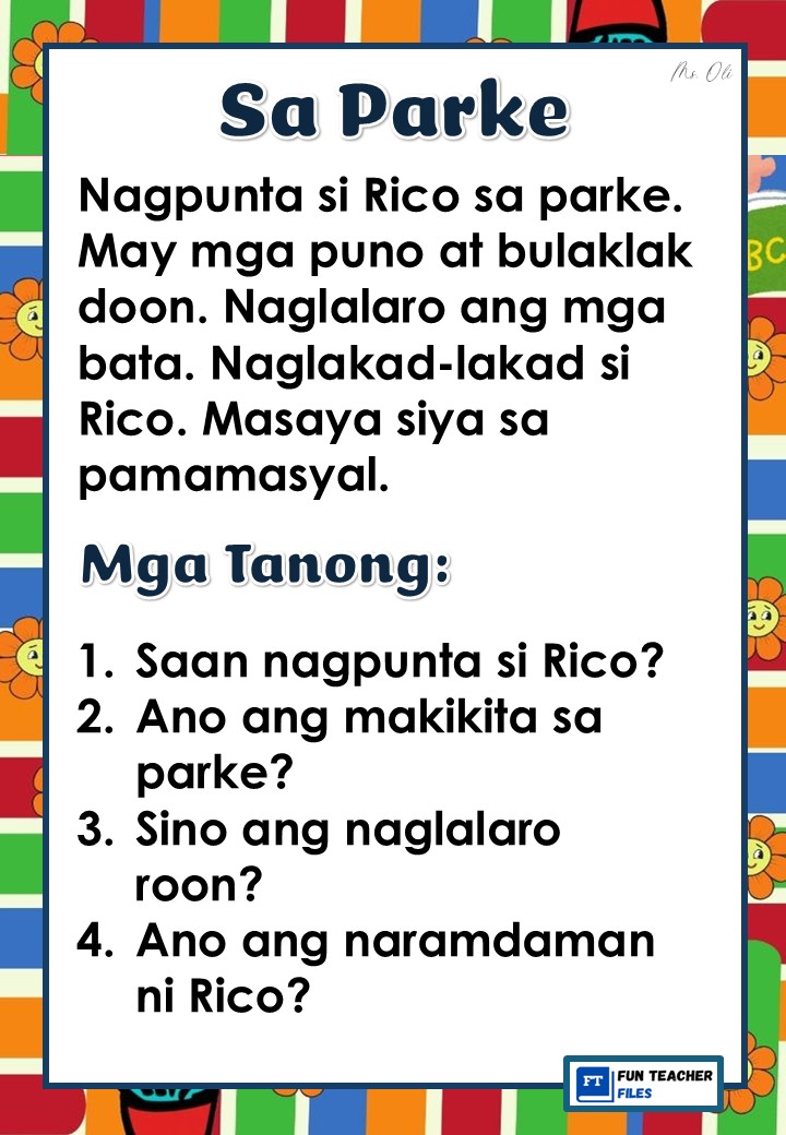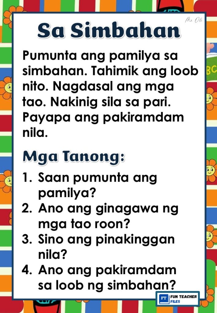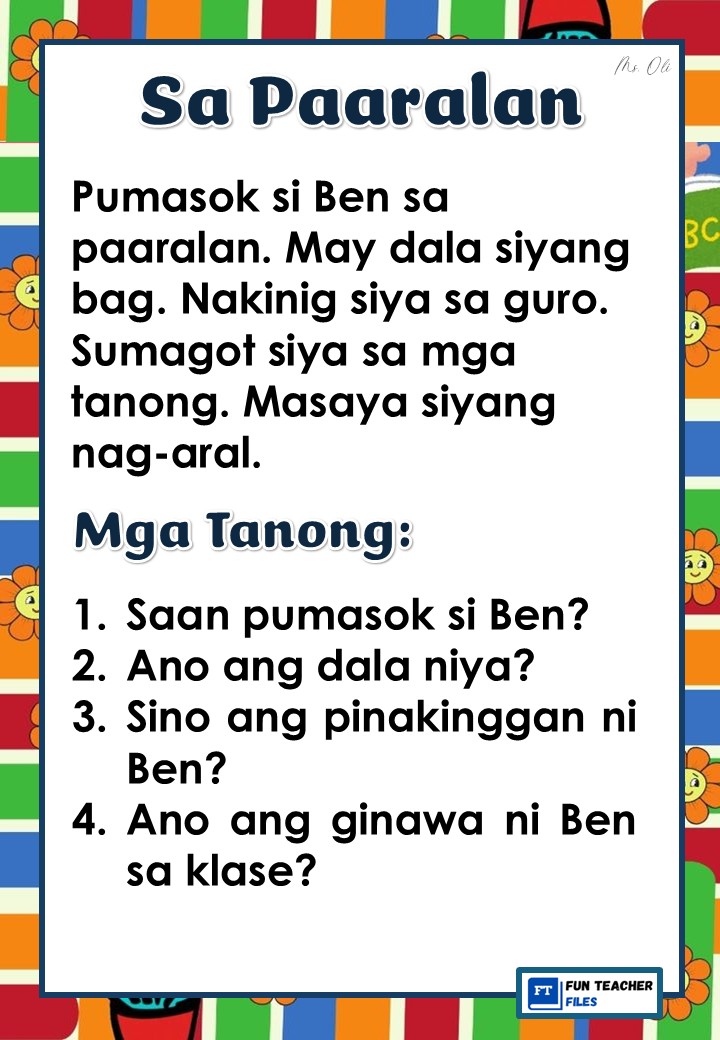 Practice reading with these Filipino Reading Materials with Comprehension Questions. These can be useful for remedial instruction or reading enhancement activity. Passages include: Sa Paaralan, Sa Simbahan, Sa Palengke, Sa Palaruan, Sa Ospital at Sa Parke.