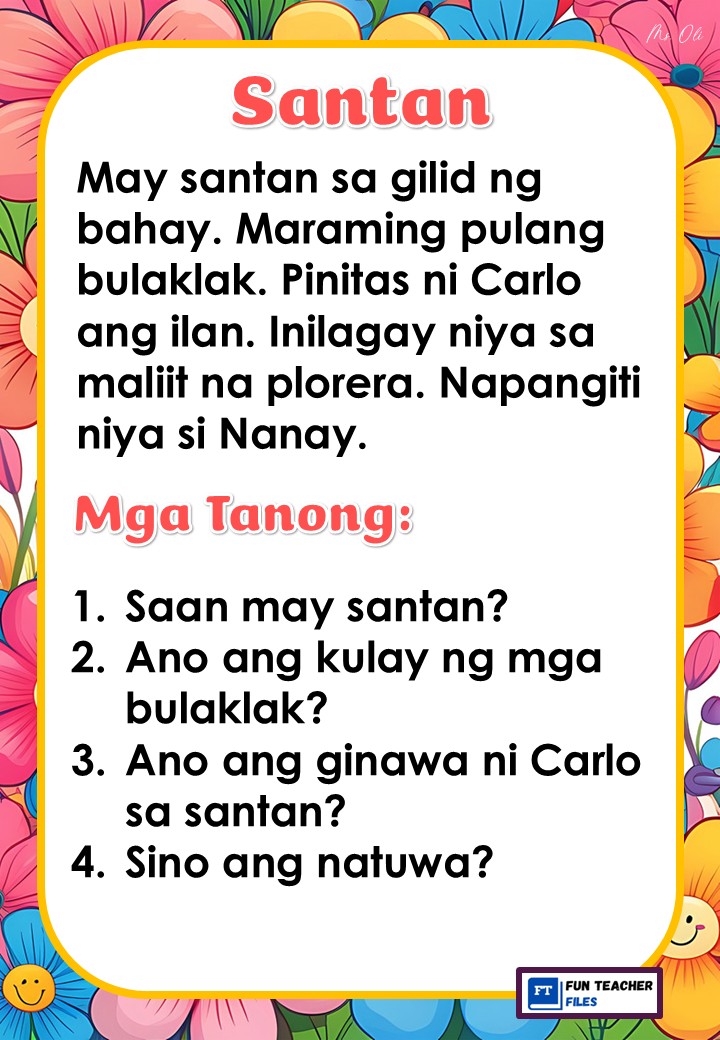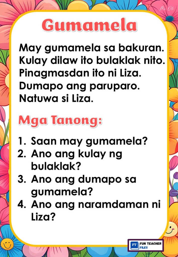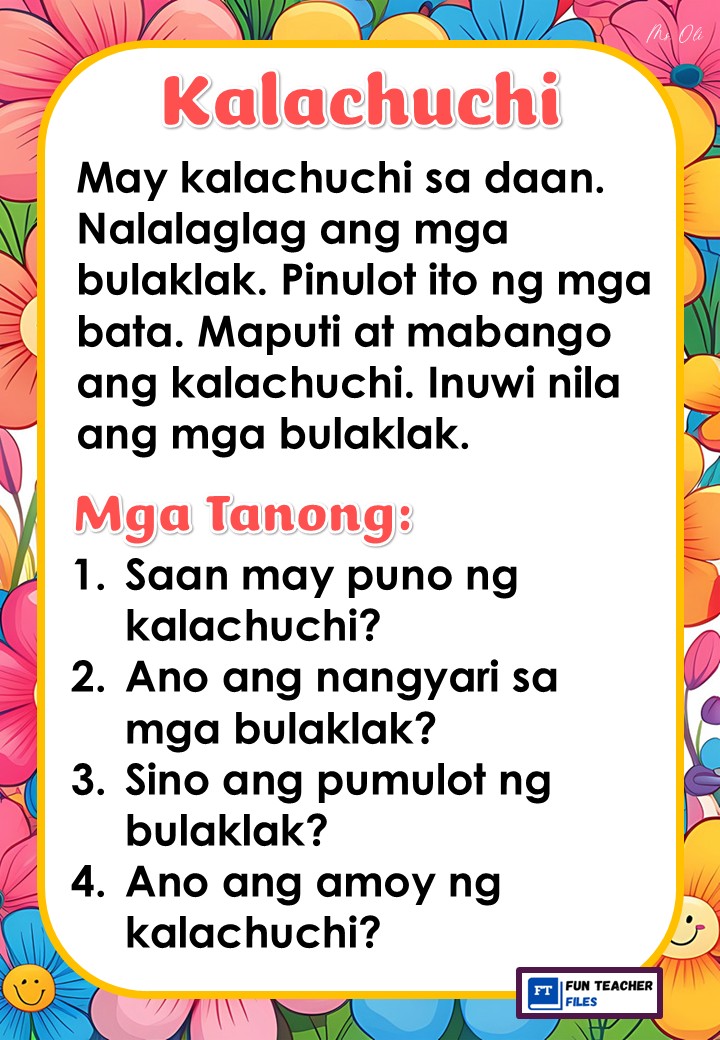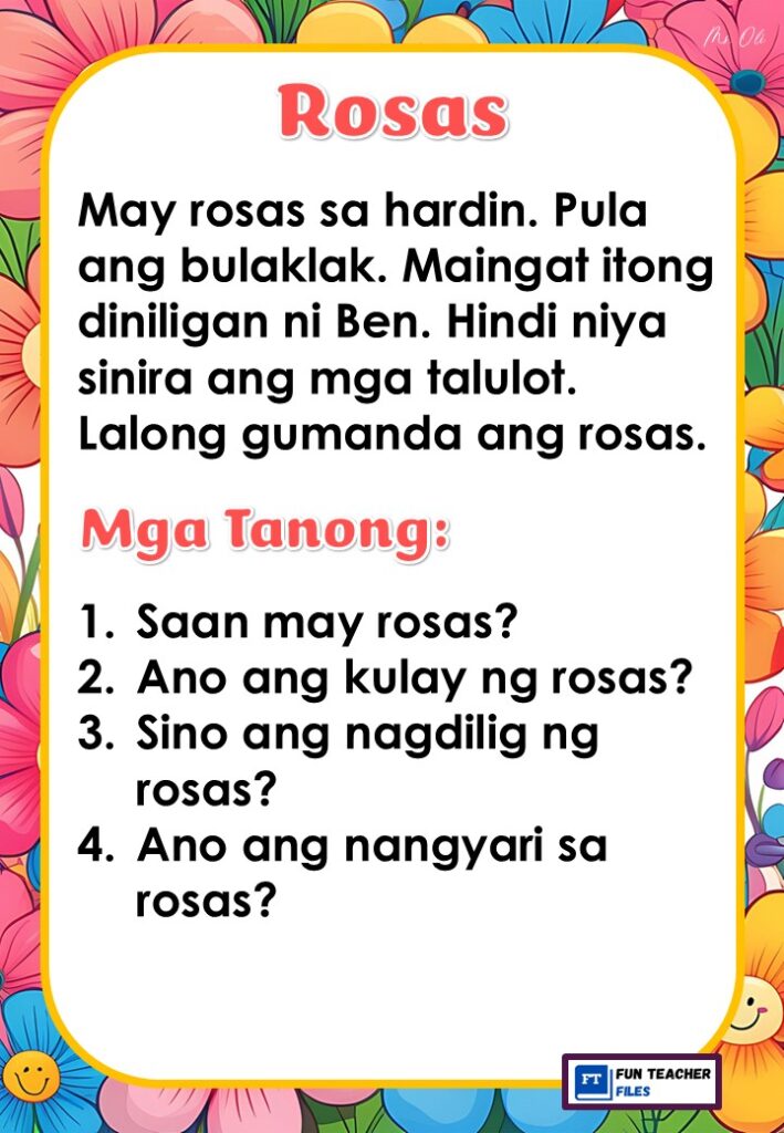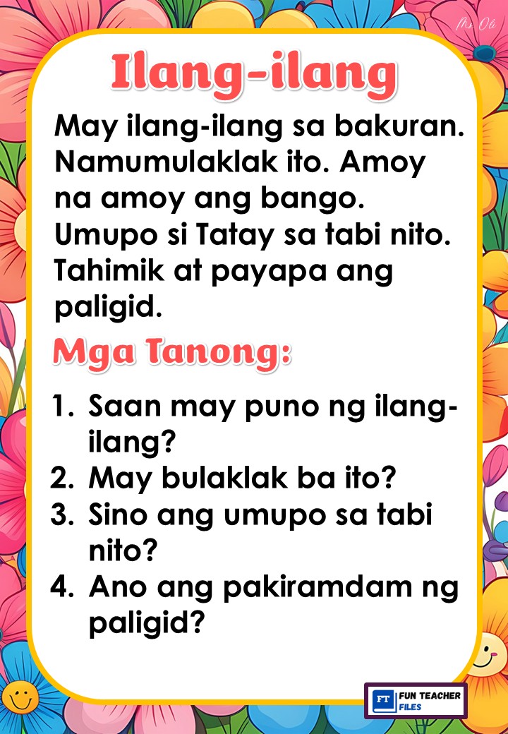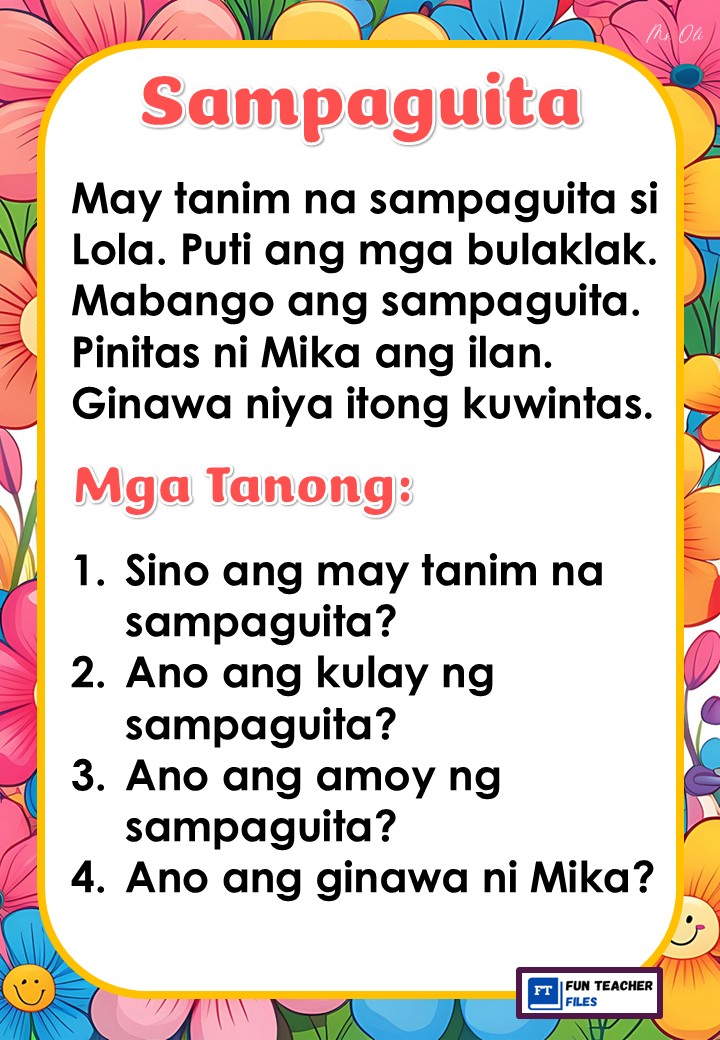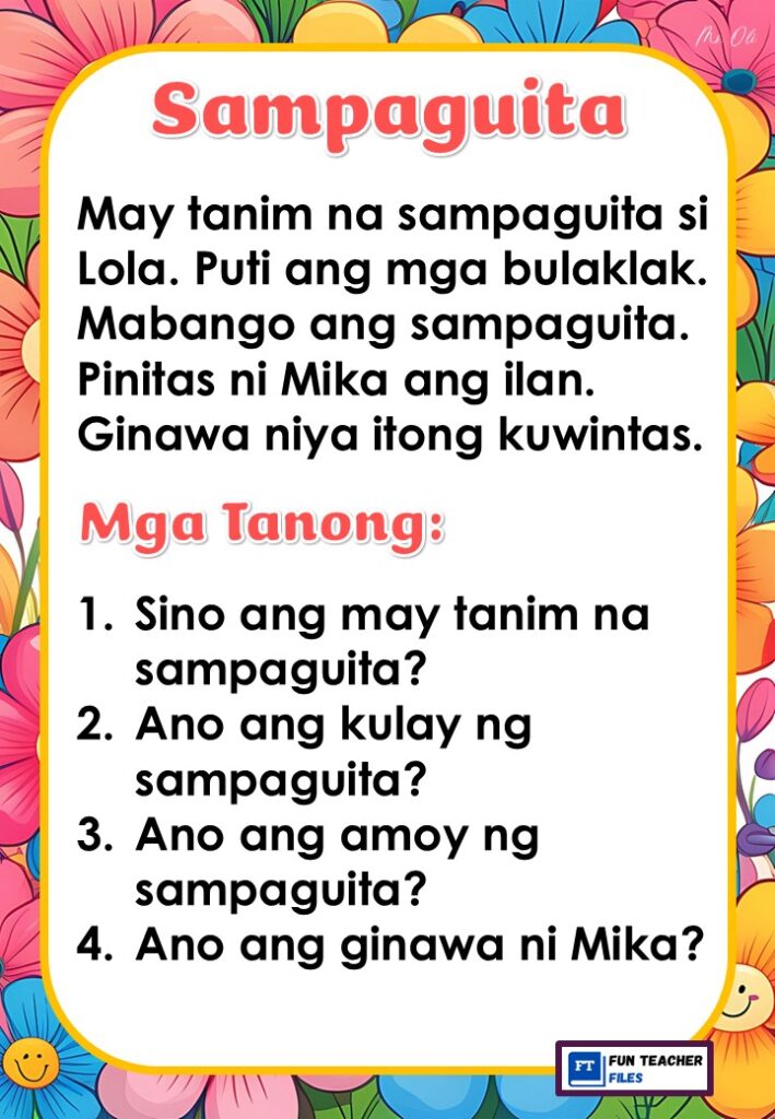Practice reading with these Filipino Reading Materials  with Comprehension Questions. These can be useful for remedial instruction or reading enhancement activity. Passages include: Rosas, Sampaguita, Gumamela, Santas, Kalachuchi, at ilang-ilang.