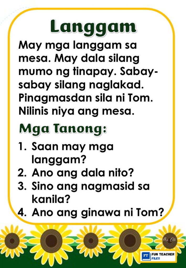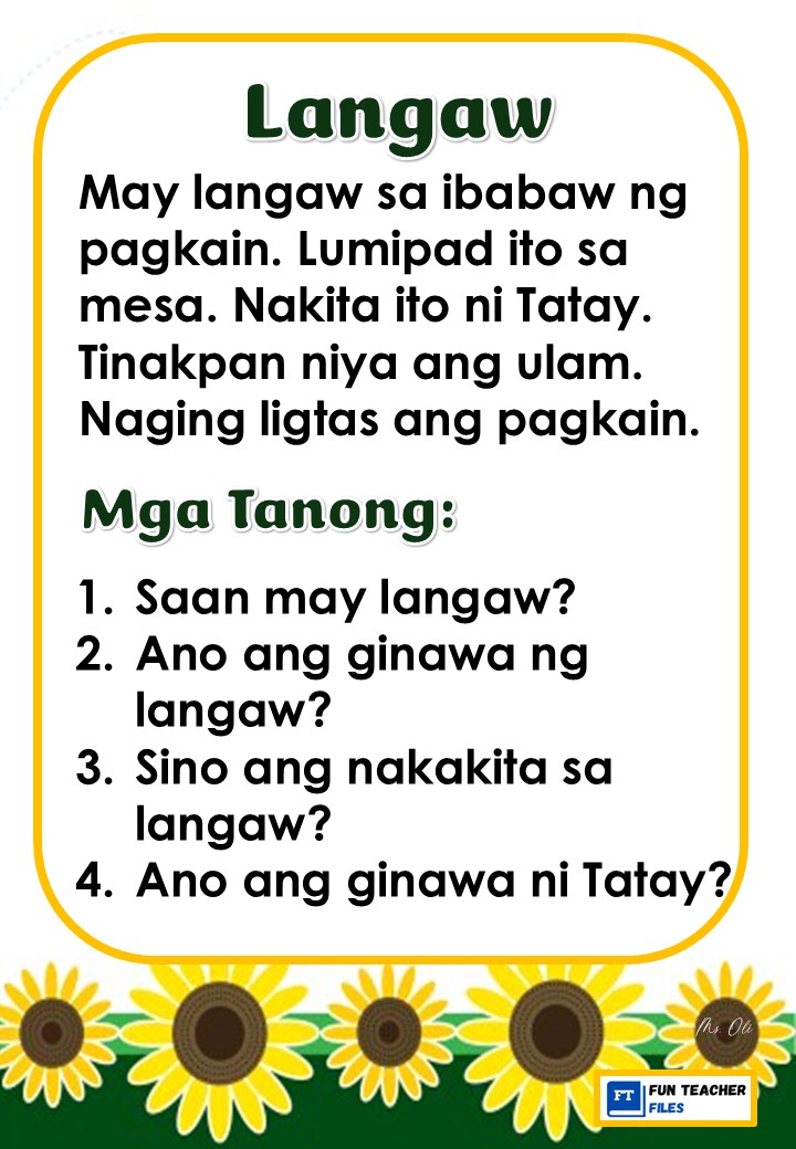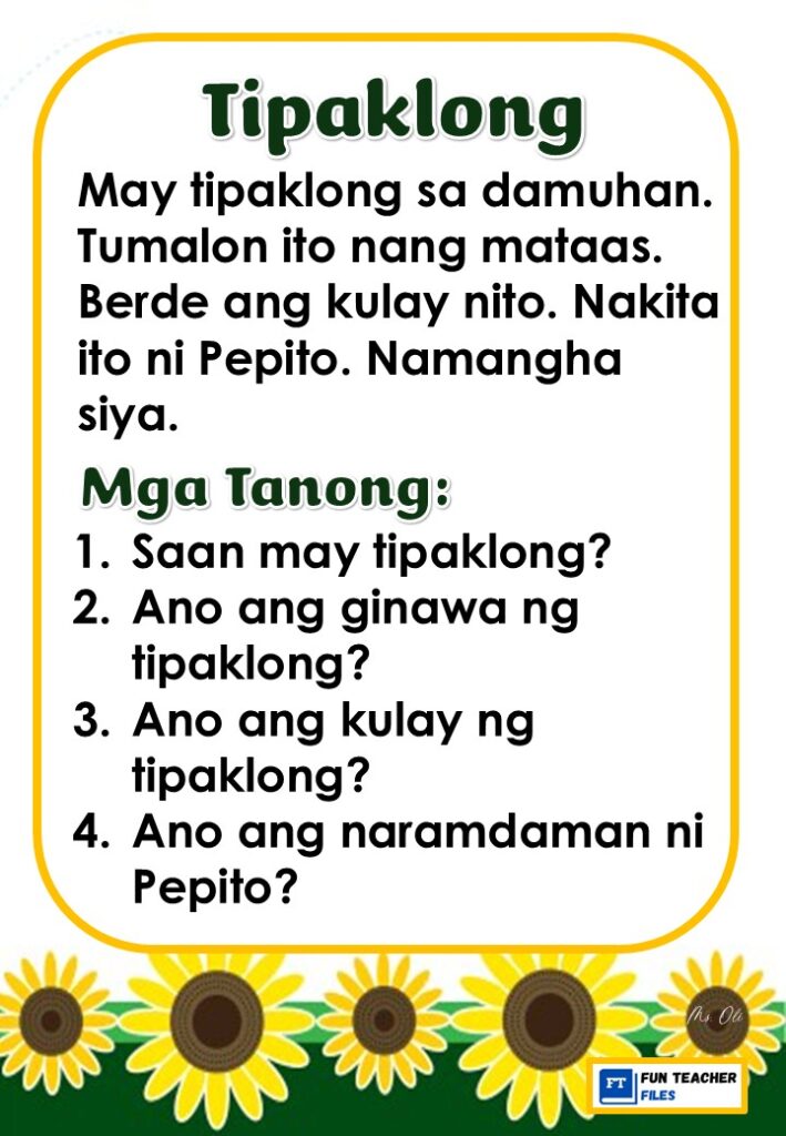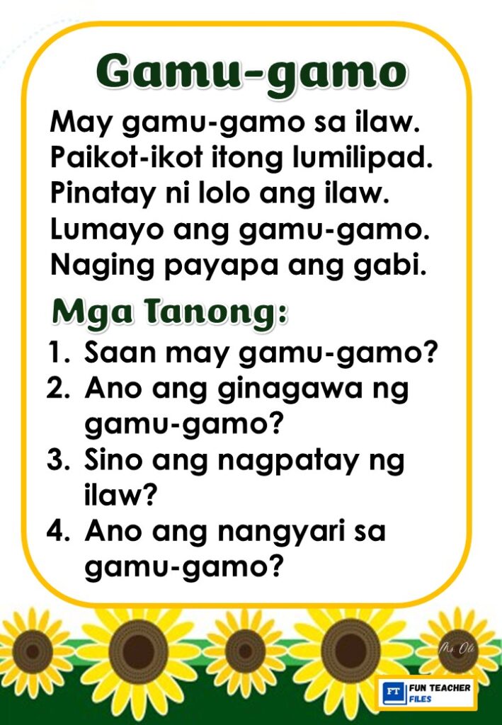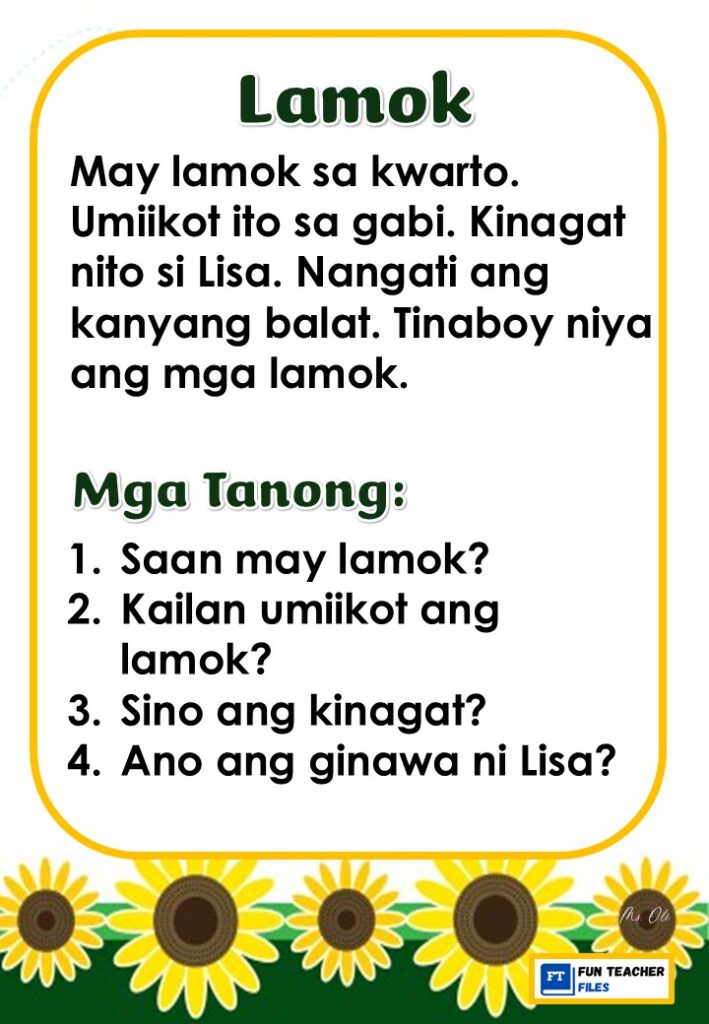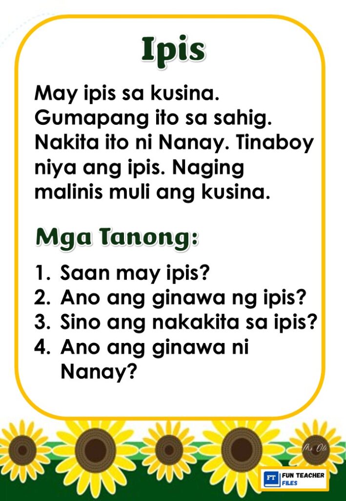Practice reading with these Filipino Reading Materials with Comprehension Questions. These can be useful for remedial instruction or reading enhancement activity. Passages include: Ipis, Langgam, Lamok, Langaw, Gamu-gamo, at Tipaklong.