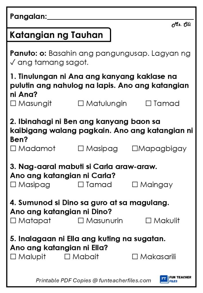Halimbawa: mabait, masipag, matulungin, masunurin. Ang worksheet na ito ay tutulong sa iyo na makilala ang katangian ng tauhan sa bawat pangungusap. Basahin nang mabuti ang sitwasyon at piliin ang tamang sagot.