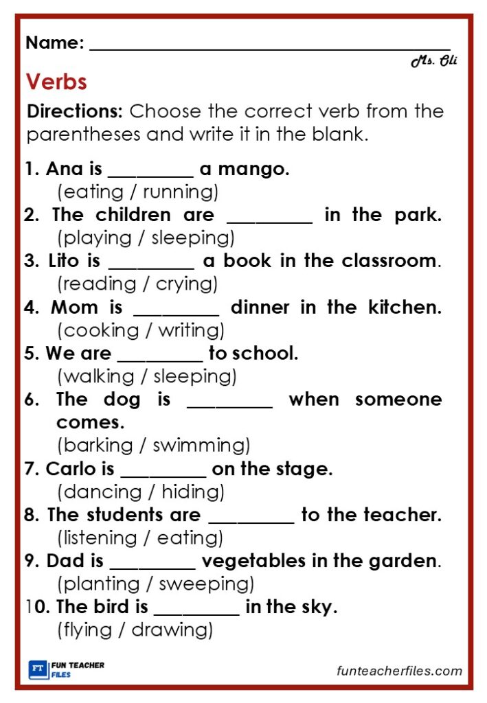 A verb is a word that shows an action, something that someone or something does. Learning verbs helps children understand how to describe actions in everyday life. In this activity, students fill in the blanks with the correct verbs, which helps them identify and use action words in sentences. It also improves their reading, thinking, and writing skills while making learning fun and interactive. Activities like this help students understand how verbs show what is happening around them.