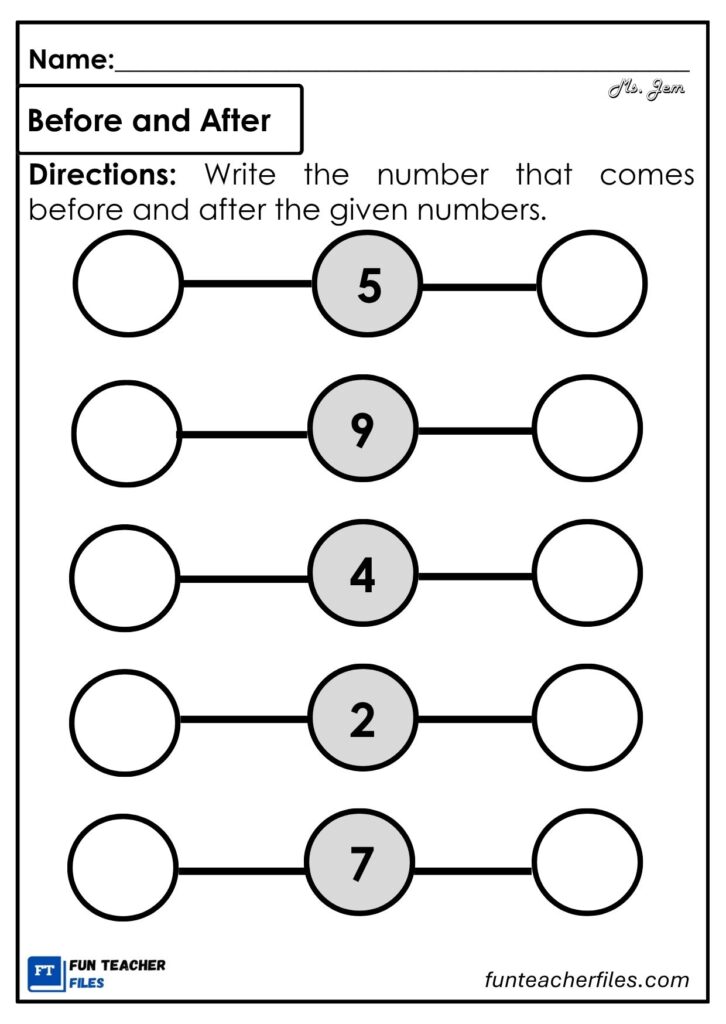 Building a strong understanding of number order is an essential step in early math learning. This “What Comes Before and After?” activity helps children practice identifying the numbers that come just before and just after a given number.