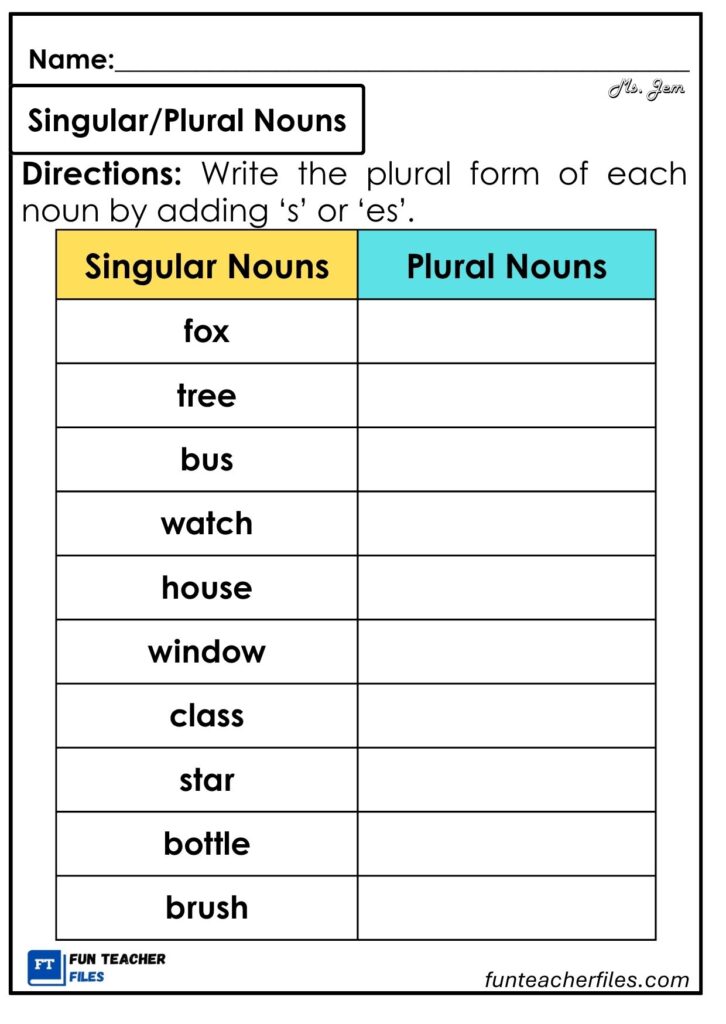 Plural nouns name more than one person, place, thing, or idea. They are formed by adding “s” or “es” to a singular noun. In this worksheet, you will practice changing singular nouns into their plural forms by applying these rules. Read each word carefully and write the correct plural form.