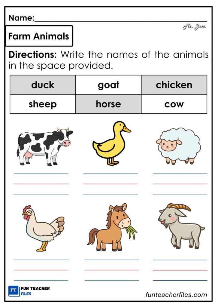 Farm animals are animals that live on farms and help people in many ways. Some give us food, while others help with work on the farm. In this worksheet, you will learn about different farm animals and practice identifying them. Look carefully at each picture and write the correct name of the animal in the space provided. Have fun learning!