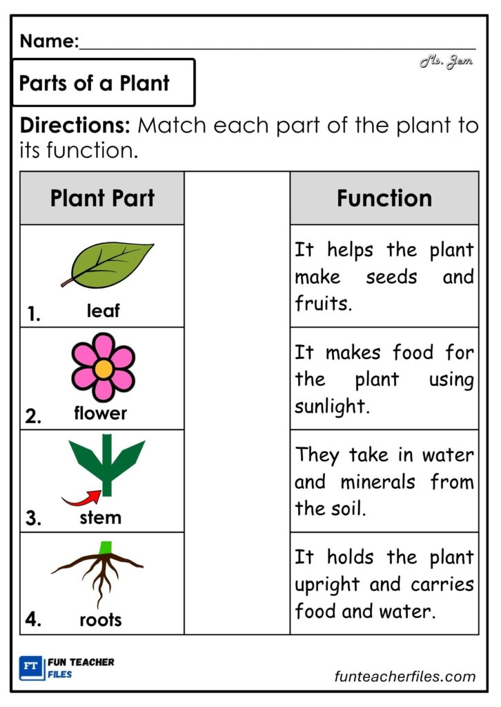 Plants are living things that grow all around us. Just like people, plants have different parts, and each part has an important job. In this worksheet, you will learn about the main parts of a plant—such as the roots, stem, leaves, and flowers—and how they help the plant live and grow. Let’s explore and discover how amazing plants are!
