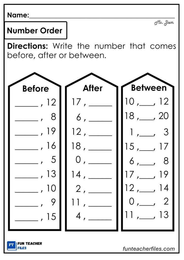 Numbers are all around us, and learning their order helps us understand how they work! In this worksheet, you will practice identifying numbers that come before, after, and between other numbers. Take your time, think carefully, and have fun learning the order of numbers!