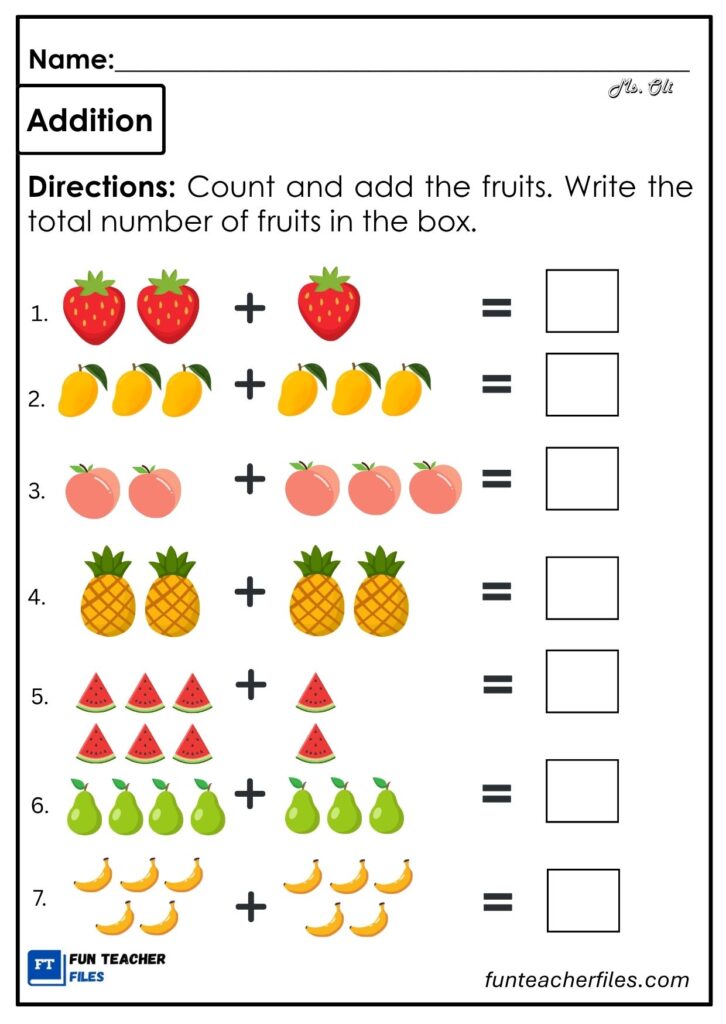 Addition is a way of putting things together to find out how many there are in all. In this worksheet, you will practice counting items and adding them to get the total. Look carefully at each group, count the fruits and then write the correct number in the box. Have fun adding! 😊