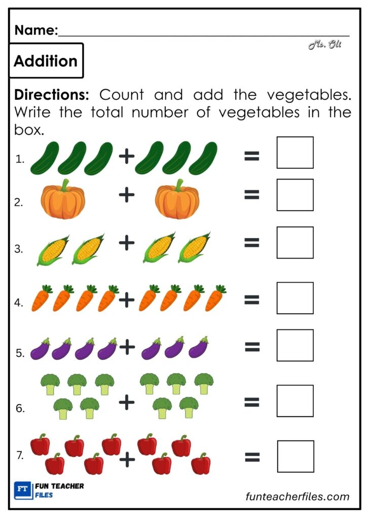 Addition is a way of putting things together to find out how many there are in all. In this worksheet, you will practice counting items and adding them to get the total. Look carefully at each group, count the vegetables and then write the correct number in the box. Have fun adding! š