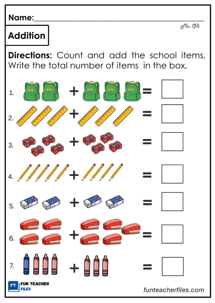 Addition is a way of putting things together to find out how many there are in all. In this worksheet, you will practice counting items and adding them to get the total. Look carefully at each group, count the school items and then write the correct number in the box. Have fun adding! 😊