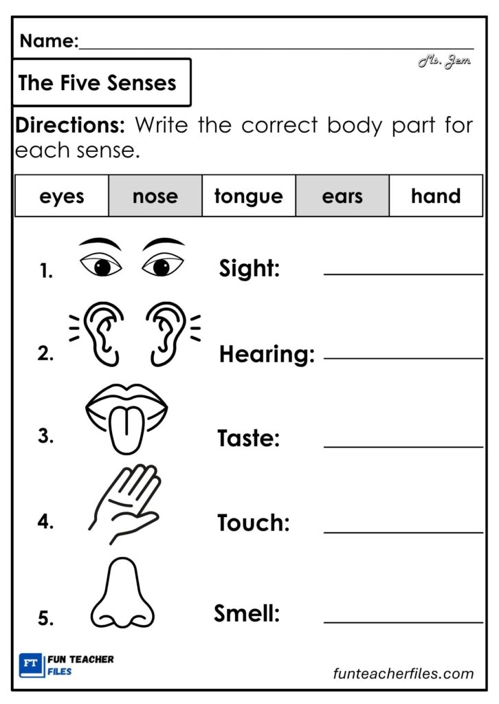 The five senses are the ways our body helps us understand and experience the world around us. Each sense uses a specific body part to work. In this worksheet, you will learn about the five senses and the body parts we use for each one. Read each item carefully and write the correct body part that helps you see, hear, smell, taste, or feel. Have fun exploring how your body works!